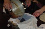 ・とっておいた米と麦芽を鍋やボウルにさらし(使い古しのTシャツの口と袖を縫ったものでもOK)をしいたところに入れ、水気をしっかりとしぼります。