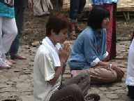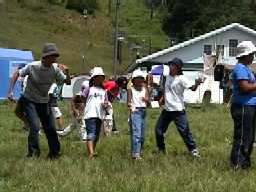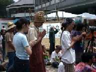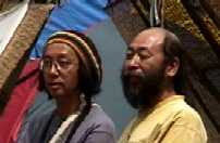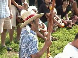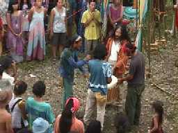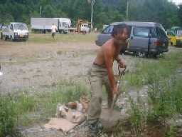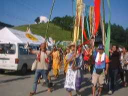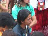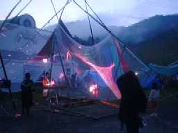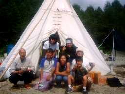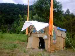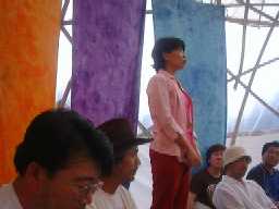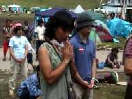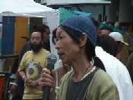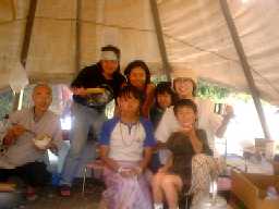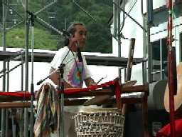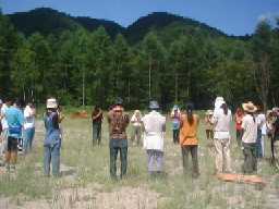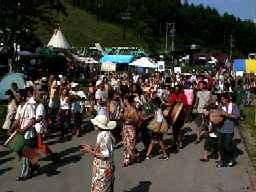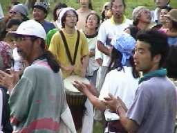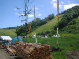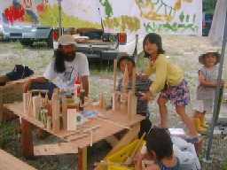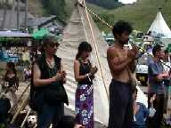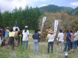 ロバート・スティードさんの葬儀の際、葬列を先導したスタッフで、ロバートさんの魂が宿るといわれているものです。1990年当時、今後10年か11年後までに日本に危機的状況に陥るであろうという夢見を得たという彼が、遠くアメリカから日本の大鹿村に赴いて危機回避のためのセレモニーを行って下さってから今年はちょうど10年目。セレモニーの2年後に大鹿村に託されたスタッフは、この祭りで初めて村を出ることになったのです。生きている者だけではなく、目には見えない多くの先人達の魂や意識とも共に調和すること。私達に向けられているこのまなざしを、尊び感謝することで、新たな時代への絆が生まれます。自然発生的に生まれた静かな祈りの集いの後、人々は不思議な力を得たように生き生きと楽しそうに動き始めました。駐車場案内係、炊事係、ヒーラー。水をタンクに確保する人々、雨に備えて新たな入村者達のためにビニールシートを竹のドームに被せる人々、駐車場スペースを拡充する人々、ドームのゴザを乾かす人、音楽を始める人、瞑想する人、子供達と向き合って絵を描く人々、補充物資を確認する人…。もうスタッフ・一般参加者の区別は、まったく存在しません。最高の役者がすべてそろった完璧な舞台のように、この村にはすべてがあるのです。すべきことは、すべき人が自然に思いついて実行していく。一人でできない作業には、周囲の人々が即座に加わる。すべての配役が、素早く完璧にこなされていくことの美しさ。生活がこのように活気あふれ、楽しいものであったなんて。すべての人が中心人物として堂々と動いているワクワク感。「この村にいない人はお巡りさんぐらいかな。人のことを叱るだけの人はいないね」。好きな時にとる休息のおしゃべりも、また楽しい。村では、けが人や体調のすぐれない人が不思議なほど早く治癒していきます。昨日、左手の指をナタで切ってしまって傷口を縫ってもらった人が、翌日にはギターを楽しげに弾いている…。一人の調和と村全体の調和が重なり合っているのです。