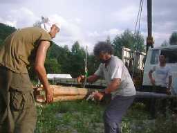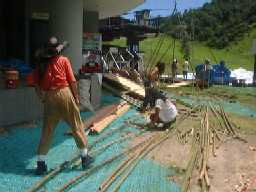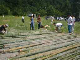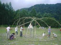 竹ドーム作りの様子です。カナディアンファームの長谷やんも差し入れを持って参加してくれて作業が進みました。10pほどのもうそうだけを割り材料を作ります。組み立て作業の時に夕立があり作業は1時中止