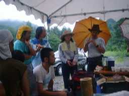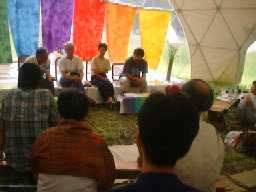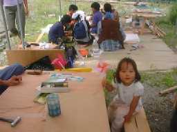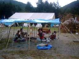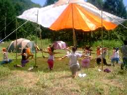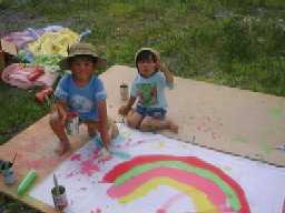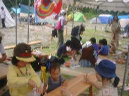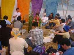 雨の上がるまでテントの下で自己紹介と親睦会 和気藹々とした雰囲気が流れます。子供達も虹の村のフラックづくりに絵の具で頑張っていました。