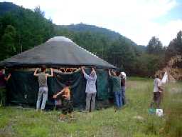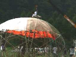 屋根にはパラシュートを掛けて側面にはビニールを張ったところで今日も夕立が降ってきました。ここで手順のミーティングをしましたがしばらく雨が続きました。雨に当たると肌寒く体が冷えてしまいます。