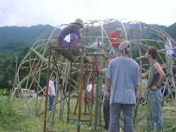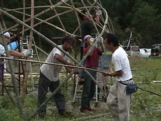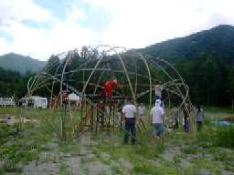 竹ドームは昨日竹割りがすみドームの骨組みが出来上がってきました。多くの人がこのプロジェクトに汗を流しています。竹の切り出し 運搬 竹割り 組み立てと 多くの時間が費やされています。自分たちで家も作ってしまう。自立の形がここにあります。