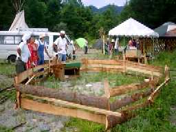 穴掘り かまどづくり 水場作りと会場の設備が整いつつあります。虹の村は何もないところだけに雰囲気は抜群です。ウグイスが鳴いて鹿島川のせせらぎの音が心地よい空間です。