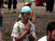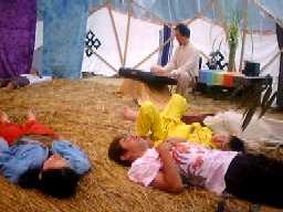 4日朝、ウォーク参加者を中心として、スー族のスウェットロッジの儀式が執り行われました。静けさの中、母なる地球の子宮を象徴するロッジに入るための心構えが淡々と語られていきます。母なる地球の子供として再び子宮に入り、その中で焼けた石に打たれた水の熱い水蒸気を心身に受ける。激しい熱さは、生まれ変わりの傷み、今までの自分自身をすべて出しきることの苦しさも伴います。「オーミタークヤ(関わりのあるすべてのもの)」という声と共に、自己と非自己という分断を超えてひとつの世界に足を踏み出した参加者達。熱い水蒸気を4回発生させ、中は息もできないほどの熱さ。「自然と泣けてきた」「近しい人の影が見えて大切なことを思い出させてくれた」「自分の唄が出てきた」「本当に、本当に、良かった」。熱いロッジの中から再び出てきた参加者達の言葉は様々ですが、その生き生きとした表情はひとつのつながりを感じさせてくれるものでした。虹の村では8日もスウェットロッジが行われる予定です(希望者は、早めに残席を確認してください)。
