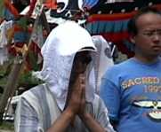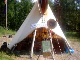 8月8日午前8時。祈りを捧げるために集まり始めた人々が静かにピースドームの中に入っていきます。静寂の中、一人ずつ広島の火をろうそくに灯しては、祭壇の上に置きます。昨夜遅く焚き火のそばで急遽決まった平和の祈りの決定は、翌朝には皆に自然に伝わり、参加者達はゆっくり丁寧に心を込めて祈りのプロセスを進めていきます。祭りの成就と平和を願う祈りと共に火を灯し終えた後、太鼓の音に合わせたインディアンの唄が始まります。参加者達の祈りの歌声が高く高く舞い上がります。そして、亡き魂達が見守ってくれている霊界ティピへ向かいます。祭壇中央に祭られた大鹿の角がつけられた杖は、メディスンマン