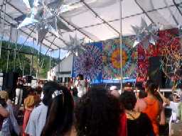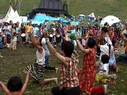 祭りは今、現在の世界の縮図だと思いませんか。様々な人々が、各々のやり方で自分自身と対面しています。それが、とってもおもしろい。メイン会場から清流を隔てて2km離れた虹の村もそうです。ただ、虹の村はメイン会場よりも規模が小さく、ゆったりと静かに時間が流れているので、いろんなことにじっくりと取り組むことができます。一人一人の行動が、確実に全体に影響を与えていることを如実に感じることができます。スピーカーズドーム、ピースドーム、地域通貨専門ブース、アマウツシシップ、キッズドーム、レインボードーム、ビッグマウンテンティピ、瞑想ティピ、ヒーリングテント、霊界ティピ…、様々に生まれ出てきた小さく静かな舞台。どうぞ、この虹の村という世界に足を運んで、本当のあなた自身を出して下さい。そして、その流れがどのようにつながっていくか、あなた自身の心と身体で感じて下さい…。
