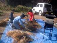 昼から仁君と誠君ウサちゃんが来て稲こきをしました。陸稲の米が少し収穫できたので稲こきとなりました。オッペルと象よろしく のんのんと稲こきが始まり楽しい一時でした。