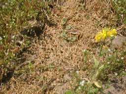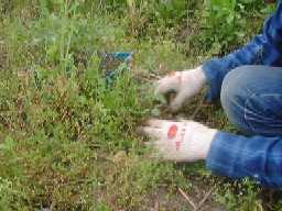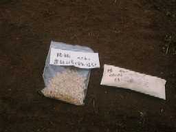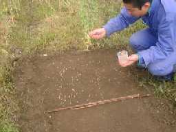 B種をおろし 隣の雑草の種のないところから土を取り種の上に両手でもむようにして種の上に土をかける。土の量は種の2倍見当です。