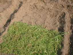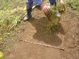C土の上から万能などで押さえつけて圧着する。切り取った草をかけて種下ろしを終了。