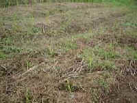 土を両手で揉むようにして種籾が隠れる程度に土をかける。土をかけ終わったら手で圧着して刈り取った雑草を均等に掛ける。
