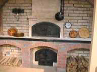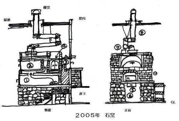 ドイツ式(かまぼこ型)の石窯で薪を燃やす炉を別に持ち、パンを焼く室は煙道の一部を大きな室として作り、排気でその焙焼室を温める方式。 連続してパンを焼く事が可能で、薪を燃やす炉の焚き口は外部にもうけ 室内側はパンの出し入れのみをする。また外部からも使えるように出し入れ口を2こ持ち室内と外部から出し入れが可能。また上部に燻製室 あり。 |